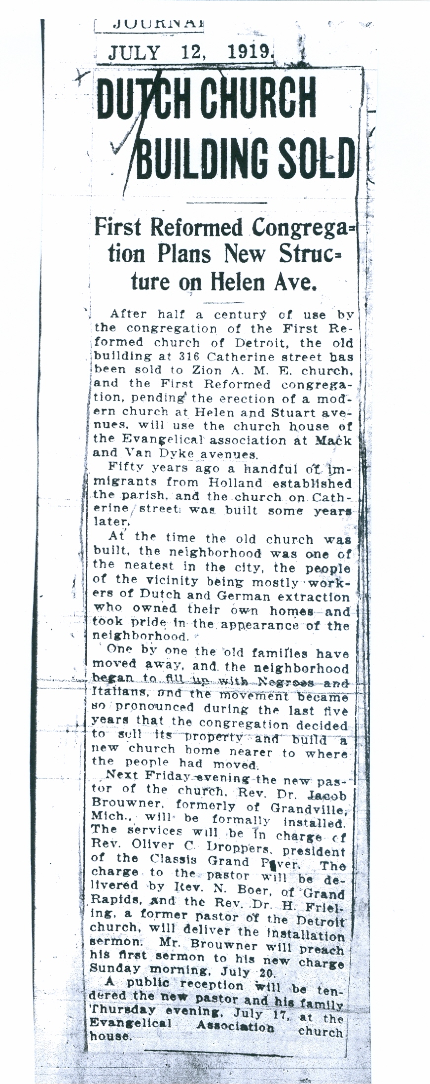 First Reformed Church of Detroit – Sale of Catherine St. Building – 1919 Source: Detroit Journal, July 12, 1919, Burton Collection, Detroit Public Library, microfilm SB Burton 86:117 Share this: Click to email a link to a friend (Opens in new window) Email Click to print (Opens in new window) Print Click to share on Facebook (Opens in new window) Facebook Click to share on X (Opens in new window) X Click to share on Pinterest (Opens in new window) Pinterest Like Loading...